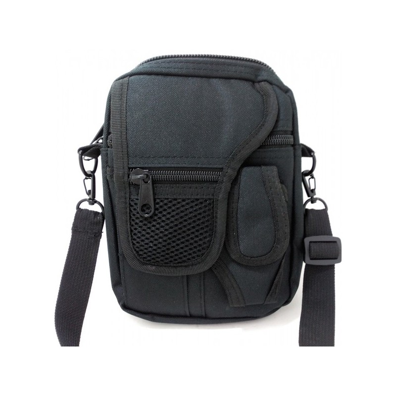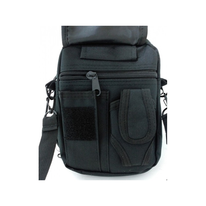 Práctica bolsa con cinta para el hombro ajustable y extraíble. Trabillas para llevar en cinturón (de hasta 6 cm ) dos grandes bolsillos : bolsillo trasero con cremallera y giratoria funda extraíble con velcro y cordones internos para la fijación de Bolsillo delantero con cremallera y banda elástica en el interior frontales dos bolsillos de parche y bolsillo con cremallera con cubierta acolchada con velcro y pequeño bolsillo con cremallera.