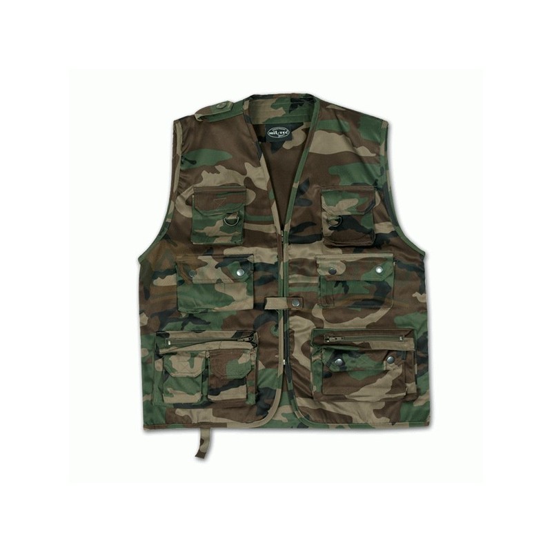 Chaleco de caza multibolsillos en color camuflaje woodland con zurrón trasero para guardar las piezas. La composición es 35% algodón y 65% poliester.