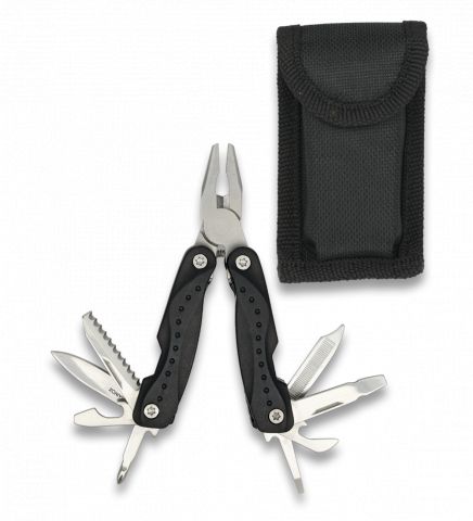 Herramienta Multiusos con Funda, ideal para servicios de emergencias, por sus múltiples usos y su capacidad de poder llevar siempre, debido a su peso y tamaño Alicate multiusos (13 usos) Mango: ABS Hojas: Acero inox Tamaño: 10.8 cm Funda de nylon