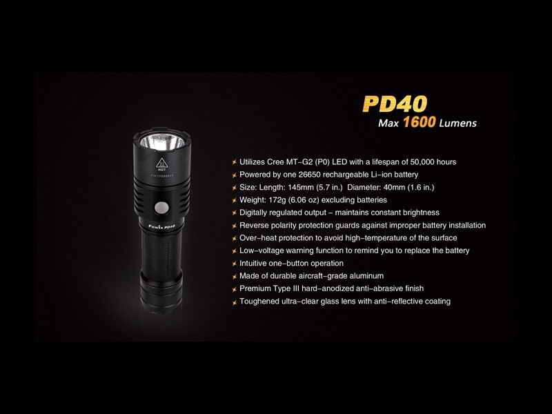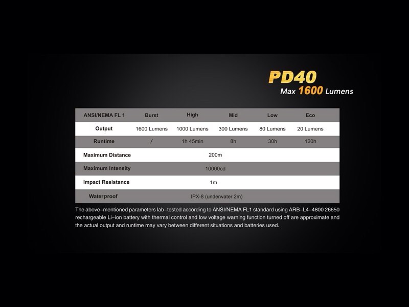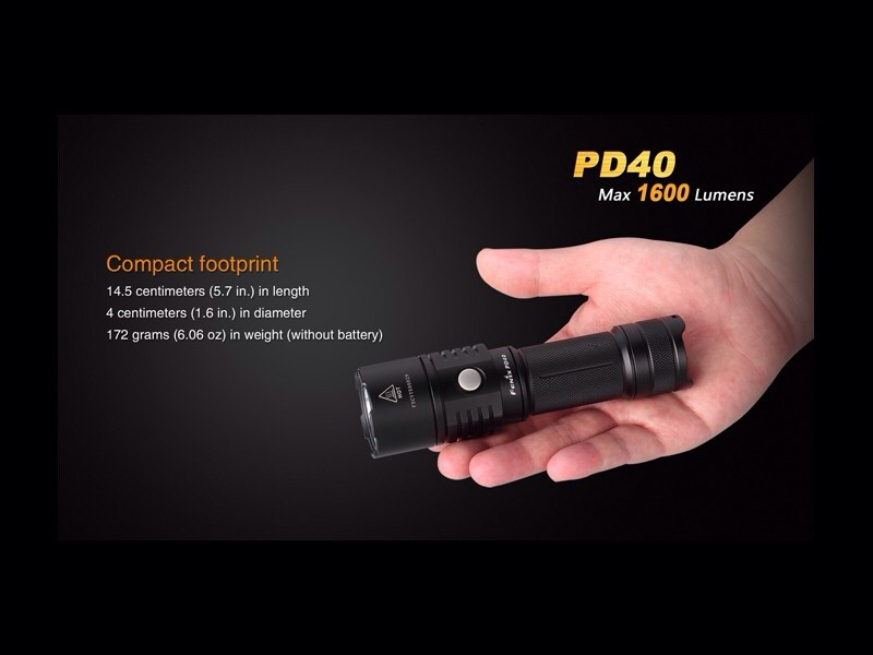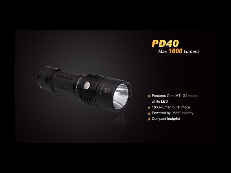 No deje que su tamaño lee engañe. La linterna compacta Fénix PD40 está equipada con un neutro LED blanco neutro muy potente. El led Cree MT-G2 el cual está alimentado por una batería 26650 de Ion-Litio recargable que impulsa la linterna hasta 1.600 lúmenes con una distancia del haz de 200 metros en solo 14.5cm.