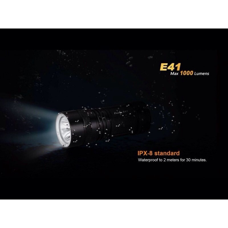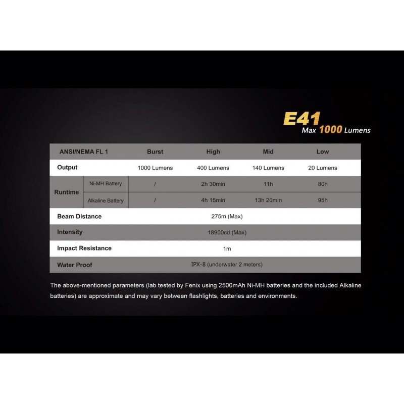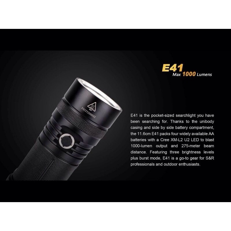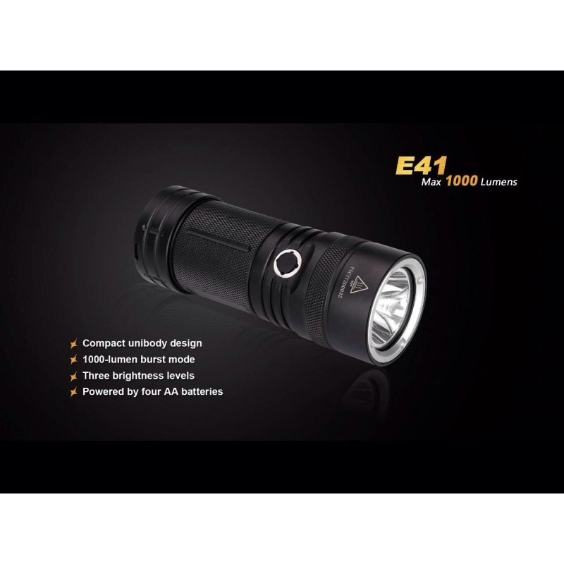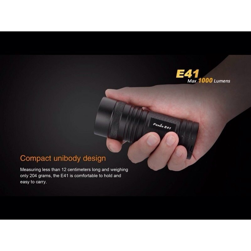 La Fénix E41 es el reflector de tamaño pequeño que usted ha estado buscando. Gracias a la carcasa compacta, en solo 11.6cm la E41 es capaz de albergar cuatro pilas AA ampliamente disponibles y alimentar un Led Cree U2 XM-L2 para alcanzar una potencia de 1000 lúmenes y una distancia del haz de 275 metros. Con tres niveles de brillo más el modo de ráfaga, la E41 será el caballo de batalla para muchos usuarios