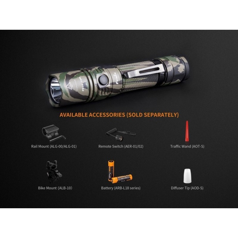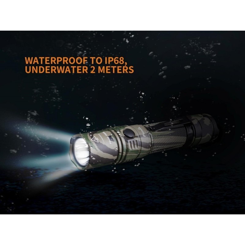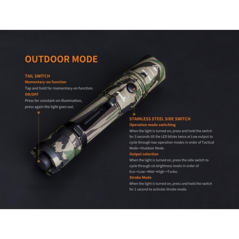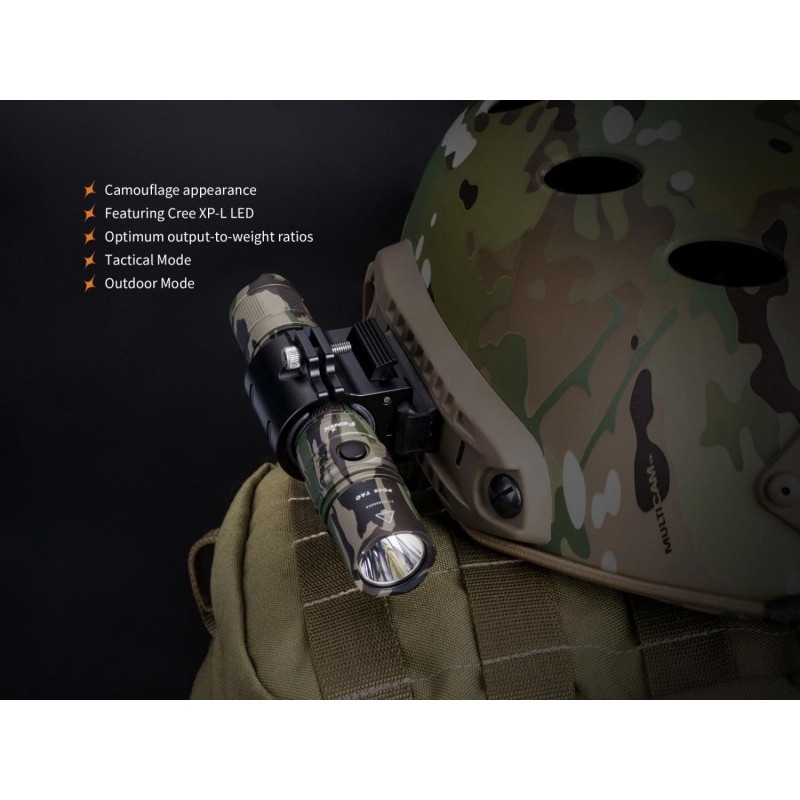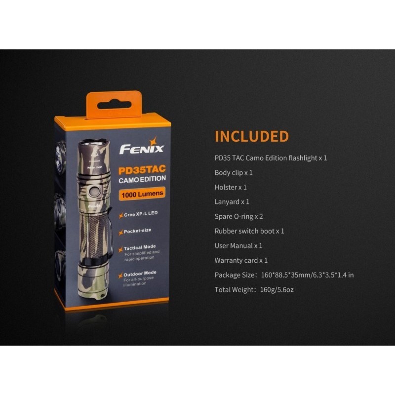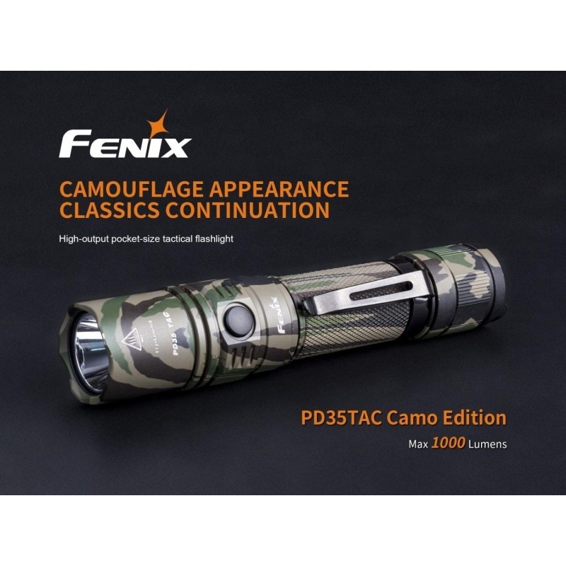 Linterna Fénix PD35TAC1000 lúmenes edición limitada camuflaje Esta linterna tiene las mismas características que la PD35Tac pero cambiar el acabado, que en este caso es de camuflaje. Atención esta linterna tiene dos modos de funcionamiento: táctico y outdoor. Para cambiar de uno a otra debe pulsar el botón del cabezal durante 3 segundos. Descripción La linterna Fénix PD35 TAC (Edición táctica), tiene un tamaño de bolsillo pero un gran rendimiento y un enfoque táctico. Midiendo menos de 14 cm de largo, la PD35TAC cuenta con una potencia de hasta 1.000 lúmenes y 200 metros de distancia. Ofrece 6 modos de salida. Sin embargo, el modo táctico permite a la PD35 TAC una operación muy fácil, intuitiva y rápida