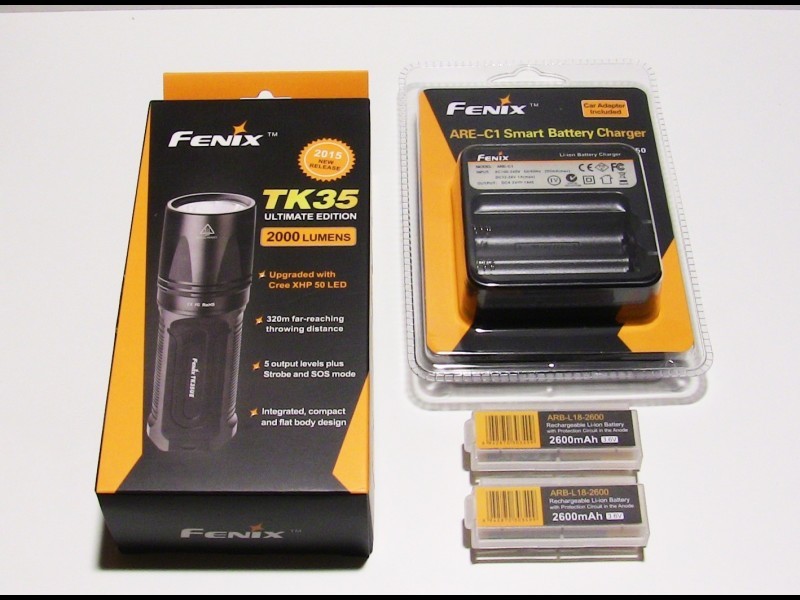 Kit completo linterna batería, cargador :TK35 2000 lúmenes + 2 ARB-L18-2600 + 1 Cargador ARE-C1 Linterna Fénix TK35 2000 lúmenes, funda, cordón para la muñeca, O-ring de recambio, manual, garantía 5 años , dos baterías ARB-L18-2600, 1 cargador ARE-C1 de dos canales con conexión toma eléctrica y coche 12 V