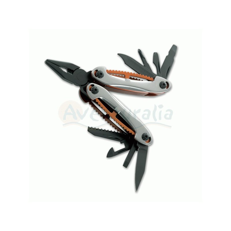 Alicates multiusos HERBERTZ con mango de aluminio blanco y naranja y hojas y cabeza negra. Dispone de los siguientes usos: Hoja, lima, abrelatas, corta alambre, abrebotellas, alicates, destornillador, sierra, descapsulador, destornillador philips, desenredador, escamador.